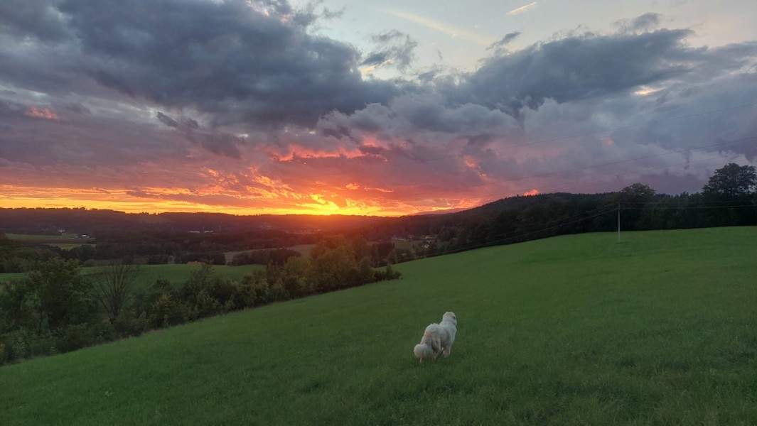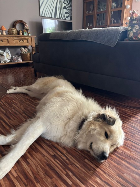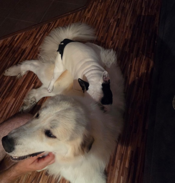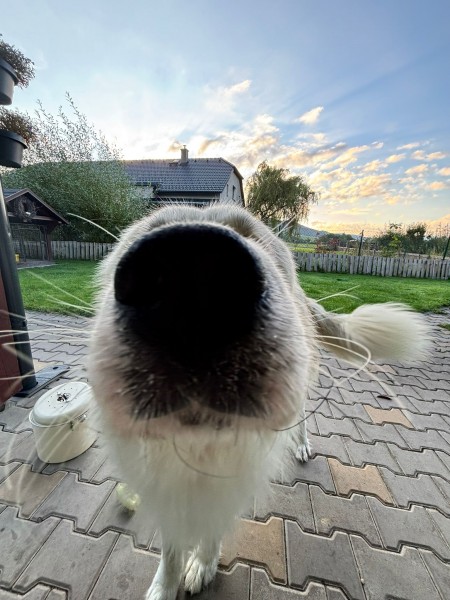 Občas v noci štěká, ale to nám nevadí.Přes den se koupe v psím bazénku a miluje procházky po lese.